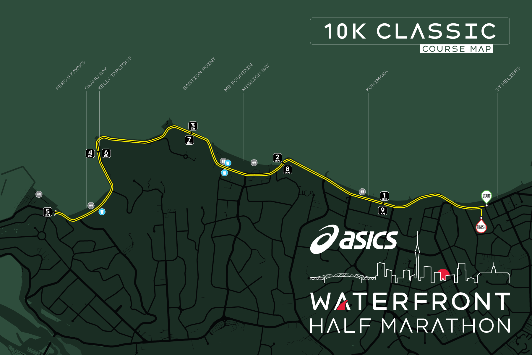 From St Heliers, follow Tamaki Drive through the Eastern beaches and join Quay St at Mechnics Bay. Run into Downtown Auckland on Quay St for a loop around The Cloud, Ferry Building and Te Kometitanga before heading back east. At Ngapipi Rd, a short out-and-back goes past the famous boat sheds before continuing east on Tamaki Drive to the finish line at Vellenoweth Green, St Heliers.