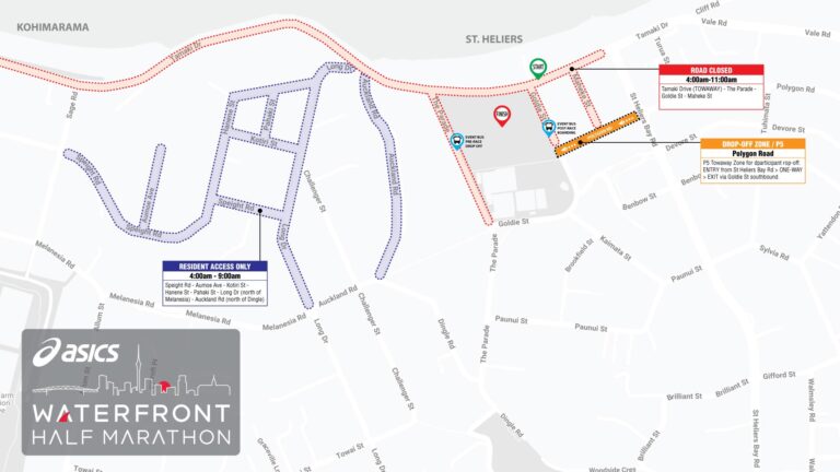 Event buses will depart from Victoria Park, Auckland City and make the approximately 30 minute trip to St Heliers. An exact map of the boarding location will appear here closer to the event. Shuttle buses will have exclusive access within the road closure and will set you down right next to the venue in The Parade. From there, bag drop and the start line are only a few minutes away.