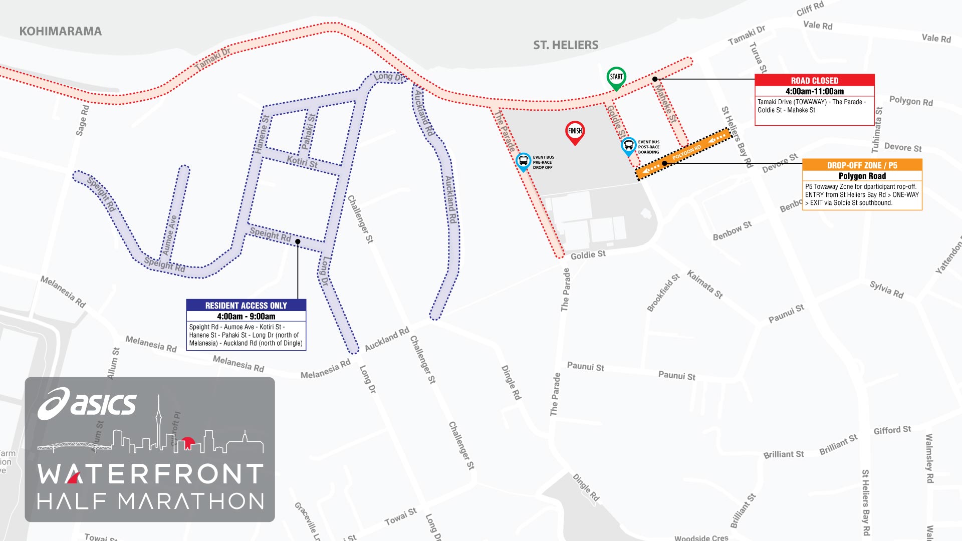 The area around the venue at Vellenoweth Green will be particulary busy and movement heavily restricted on race morning. It is best avoided if at all possible. Keep in mind that the entire length of Tamaki Drive - from St Heliers Bay Road west - is a towaway zone which will be rigorously enforced on race morning.This location map highlights the location of start and finish lines, the event bus drop off (pre-race) and boarding (post-race) points and the drop off area located in Polygon Rd. Take careful note, also, of the resident access only area to the west of the venue. These roads are not available for parking on race morning to ensure access for bus services.