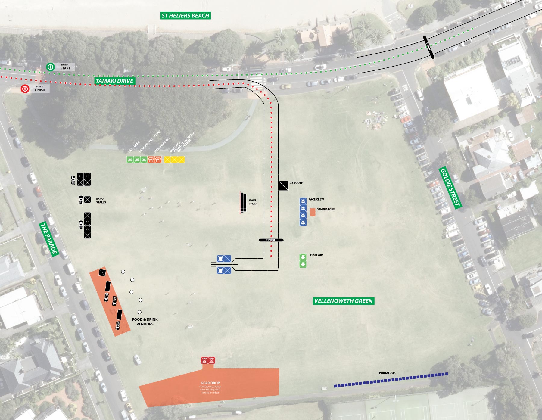 With such a large venue at our disposal, we can spread out a little bit and make room for all the exciting activations and attractions which make this event so special. The finish line is at the absolute geometric centre of the reserve with the start line on Tamaki Drive, just beyond the north-eastern corner of the reserve.